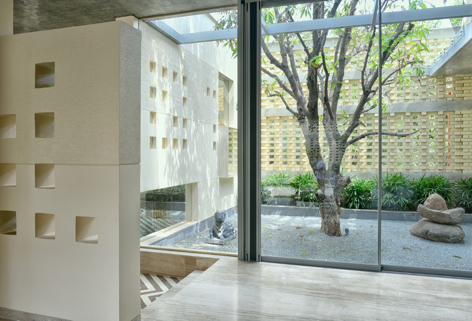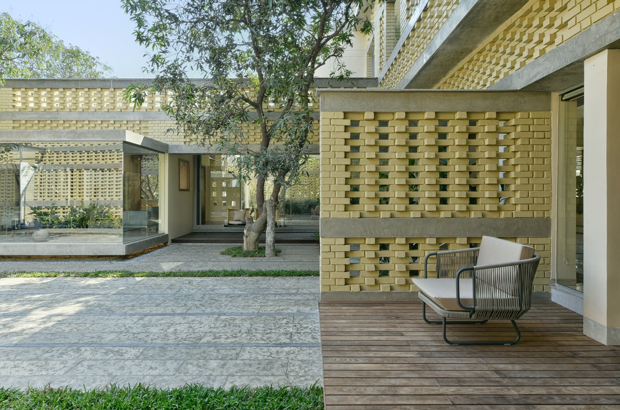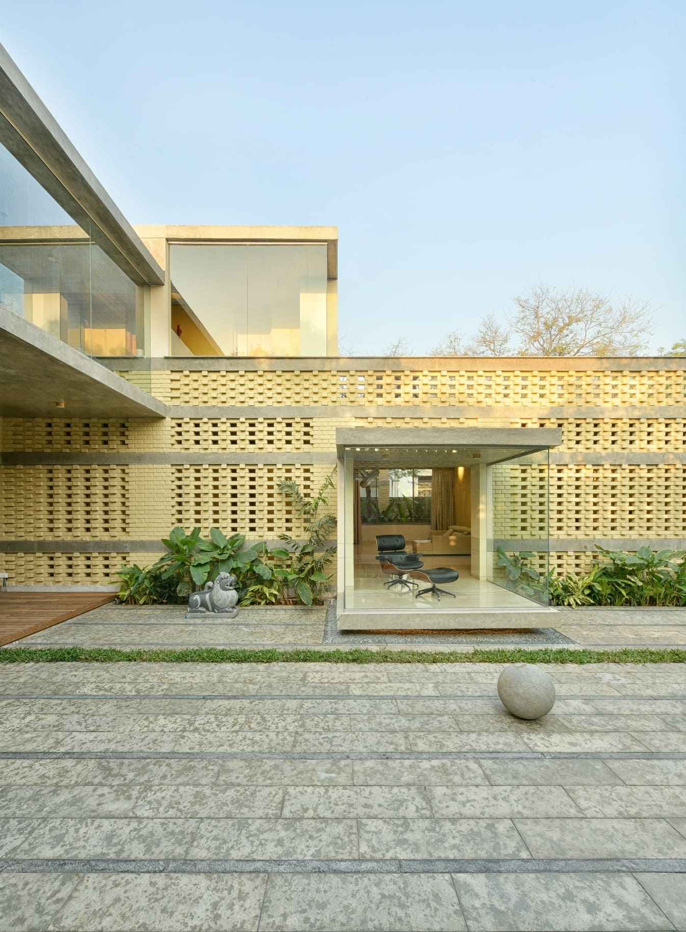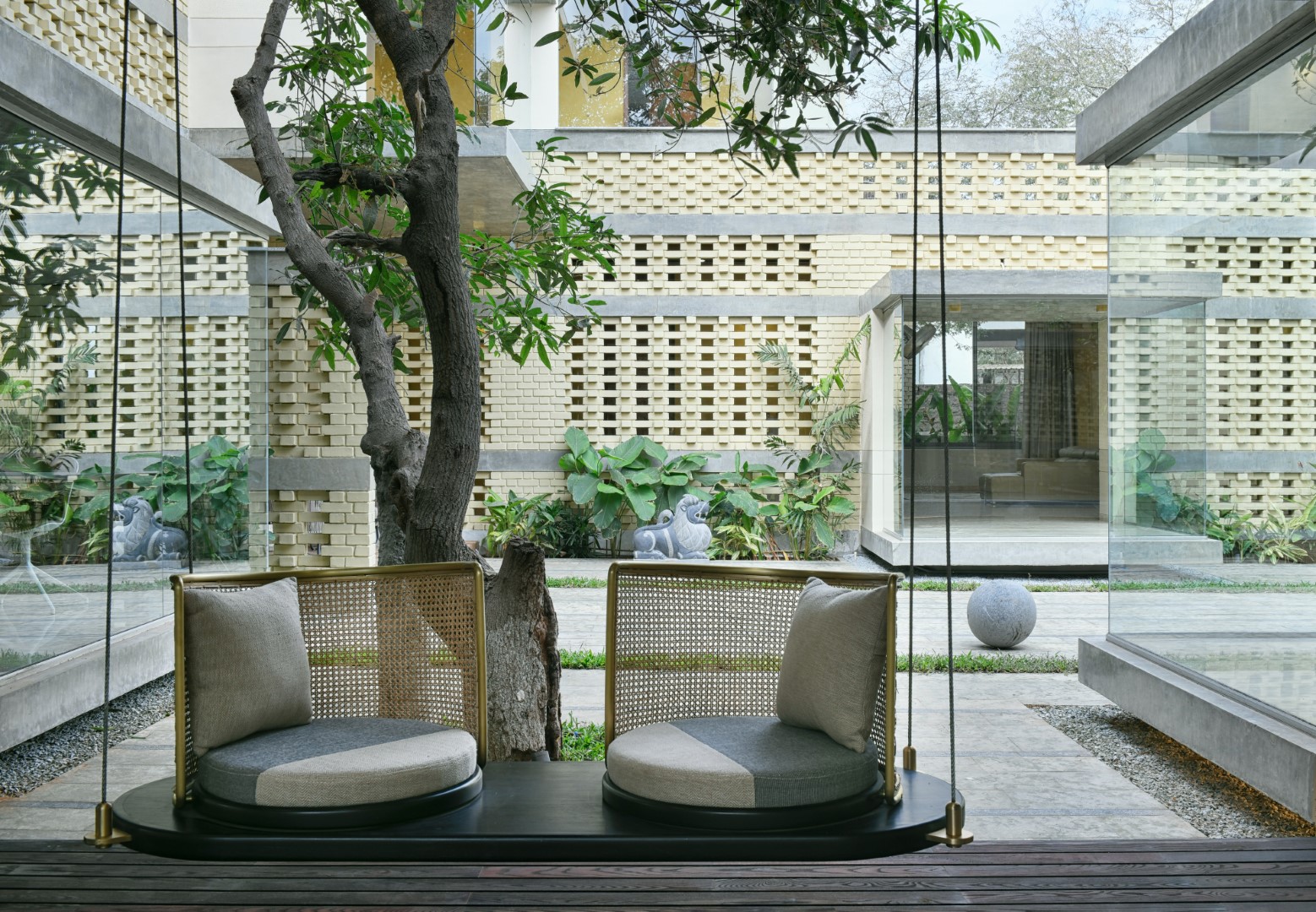 A home where lighting celebrates texture. Carefully placed beams highlight exposed brick, soften edges, and add warmth across courtyards and interiors — turning structure into story and light into atmosphere.