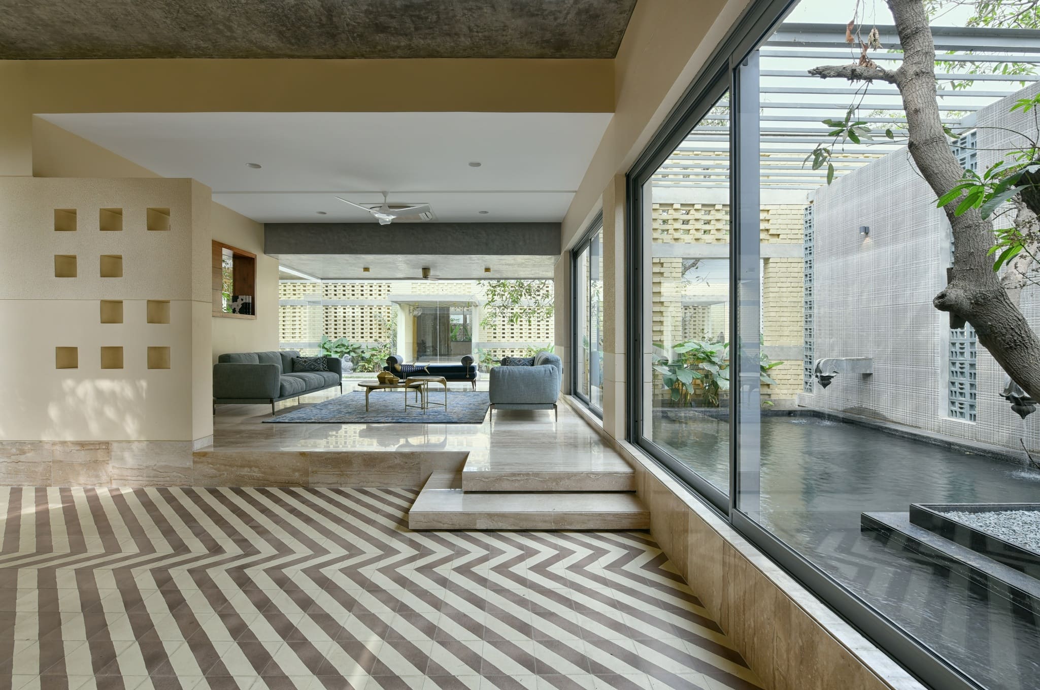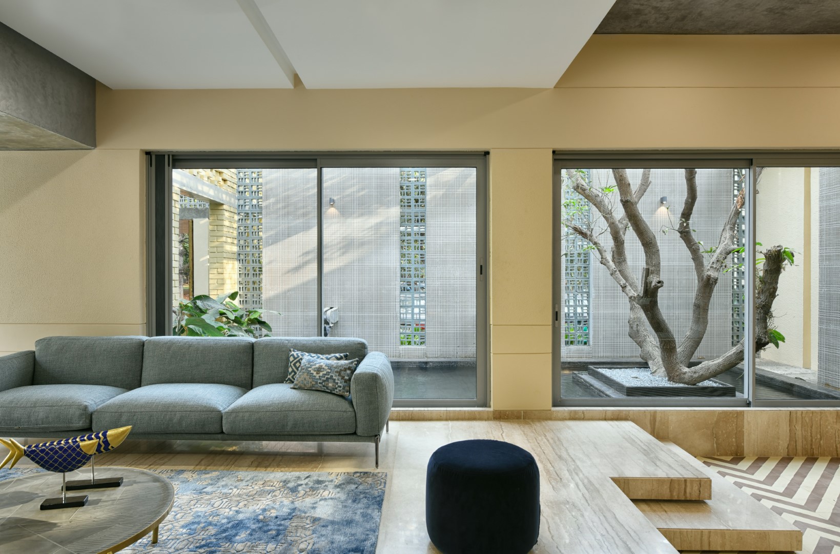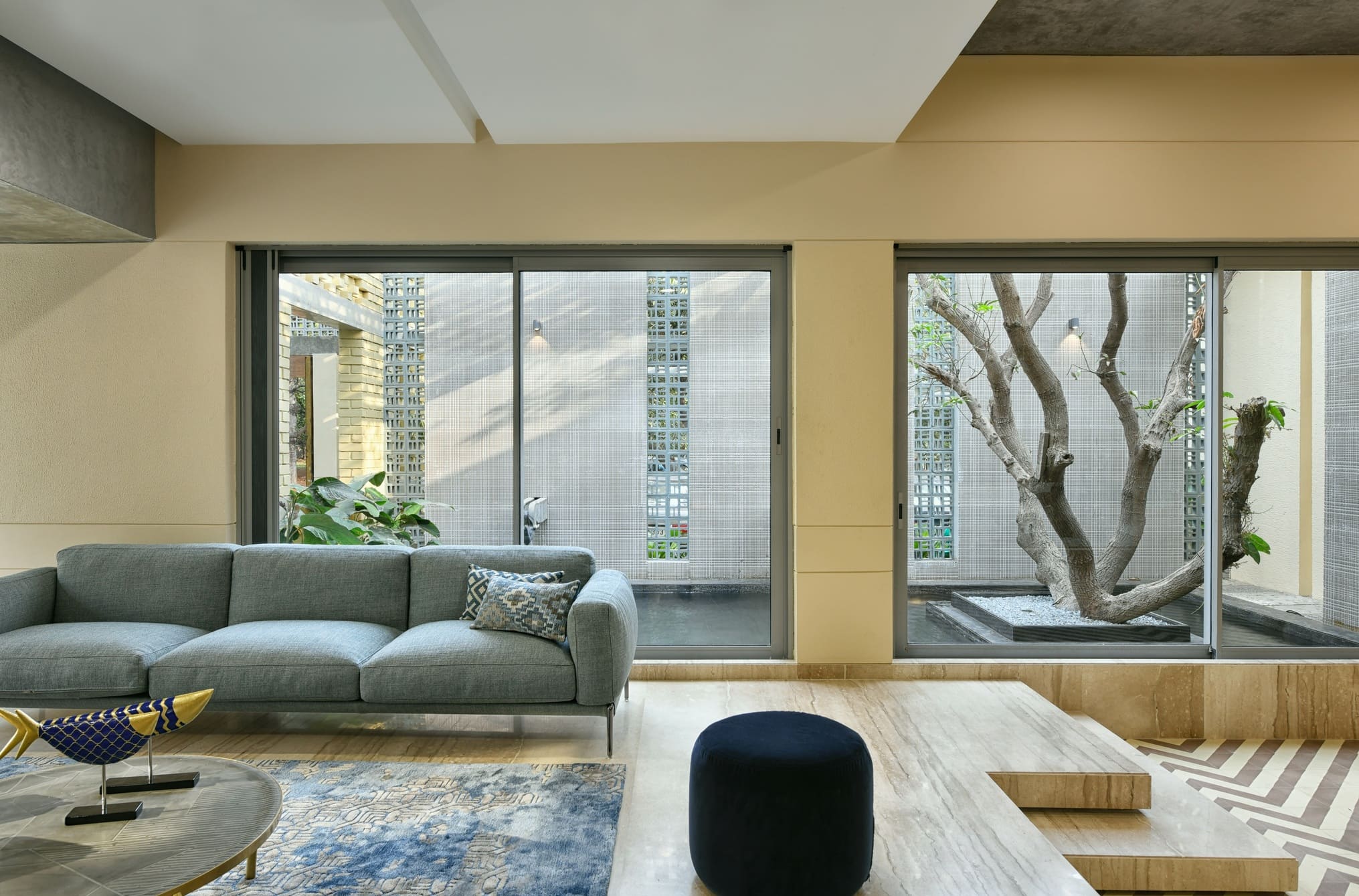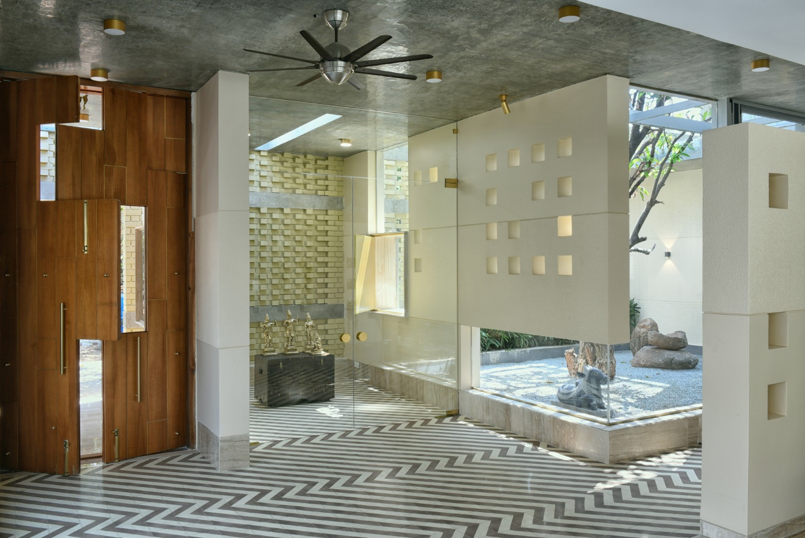 A home where lighting celebrates texture. Carefully placed beams highlight exposed brick, soften edges, and add warmth across courtyards and interiors — turning structure into story and light into atmosphere.