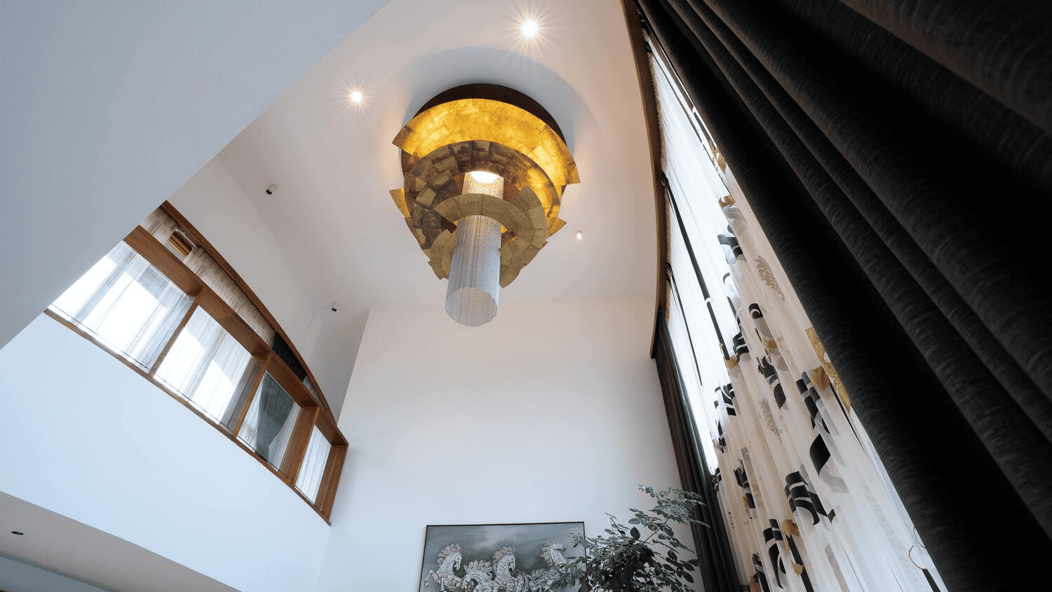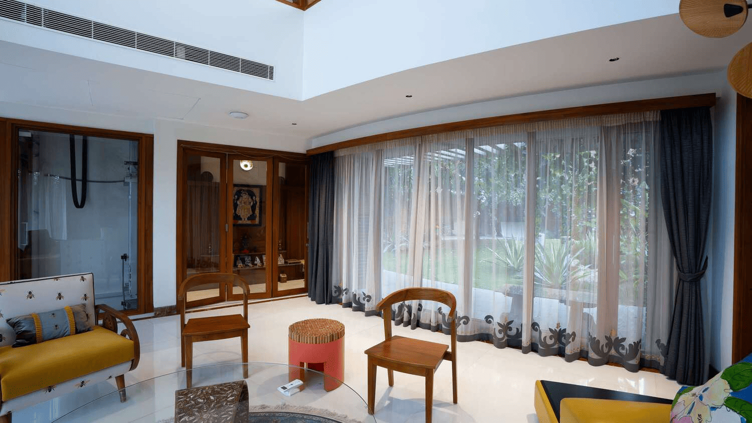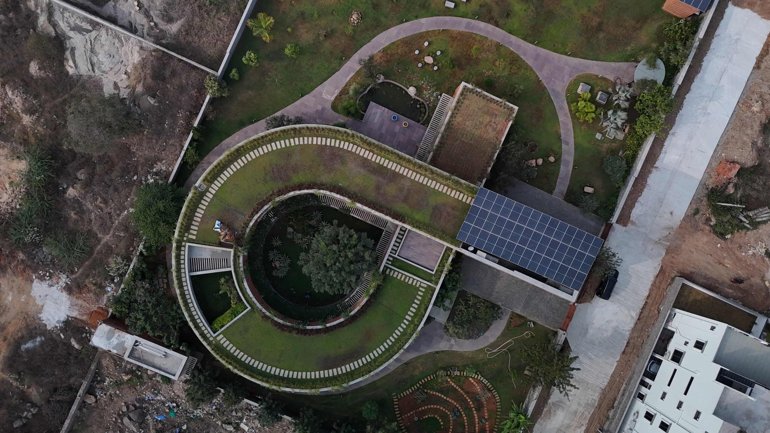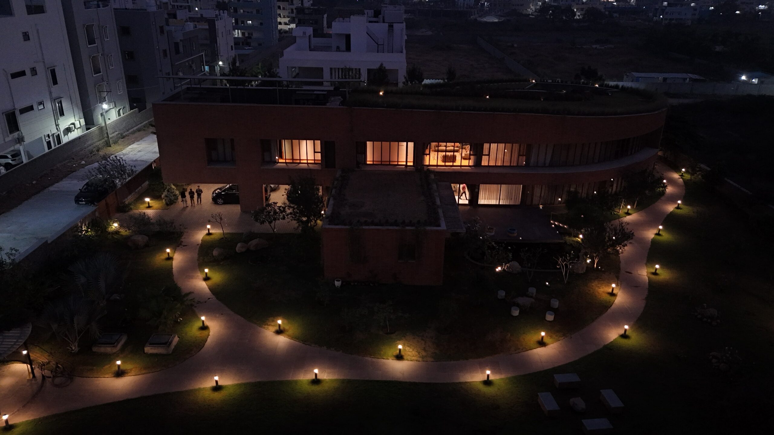 Strategic lighting highlights luxury interiors, the private home theatre, and nature-integrated spaces. Each light is placed to enhance mood, structure, and sustainability — from rooftop greenery to ambient outdoor paths.