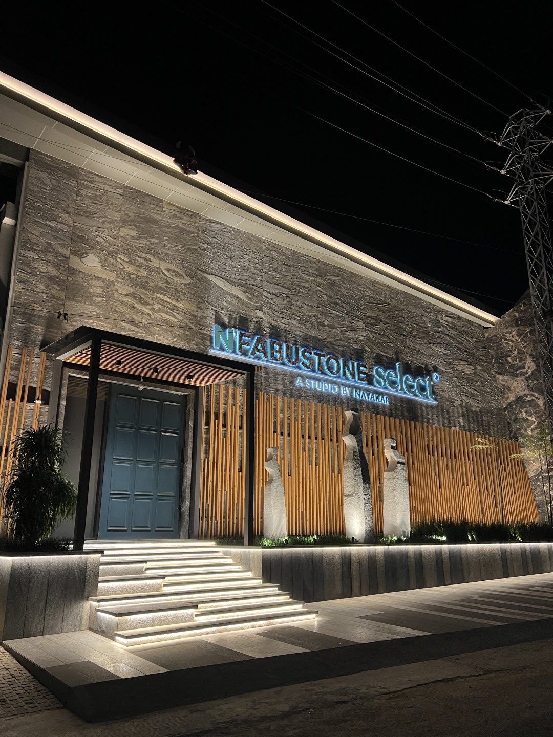 Our planning for N’Fabustone Studio's Shamshabad expansion, N’Fabustone Select, showcases architectural elegance with strategically placed facade lights. Meticulous lighting arrangements define the welcoming entrance, cozy cafe ambiance, and professional conference room, emphasizing the timeless beauty of natural stones.