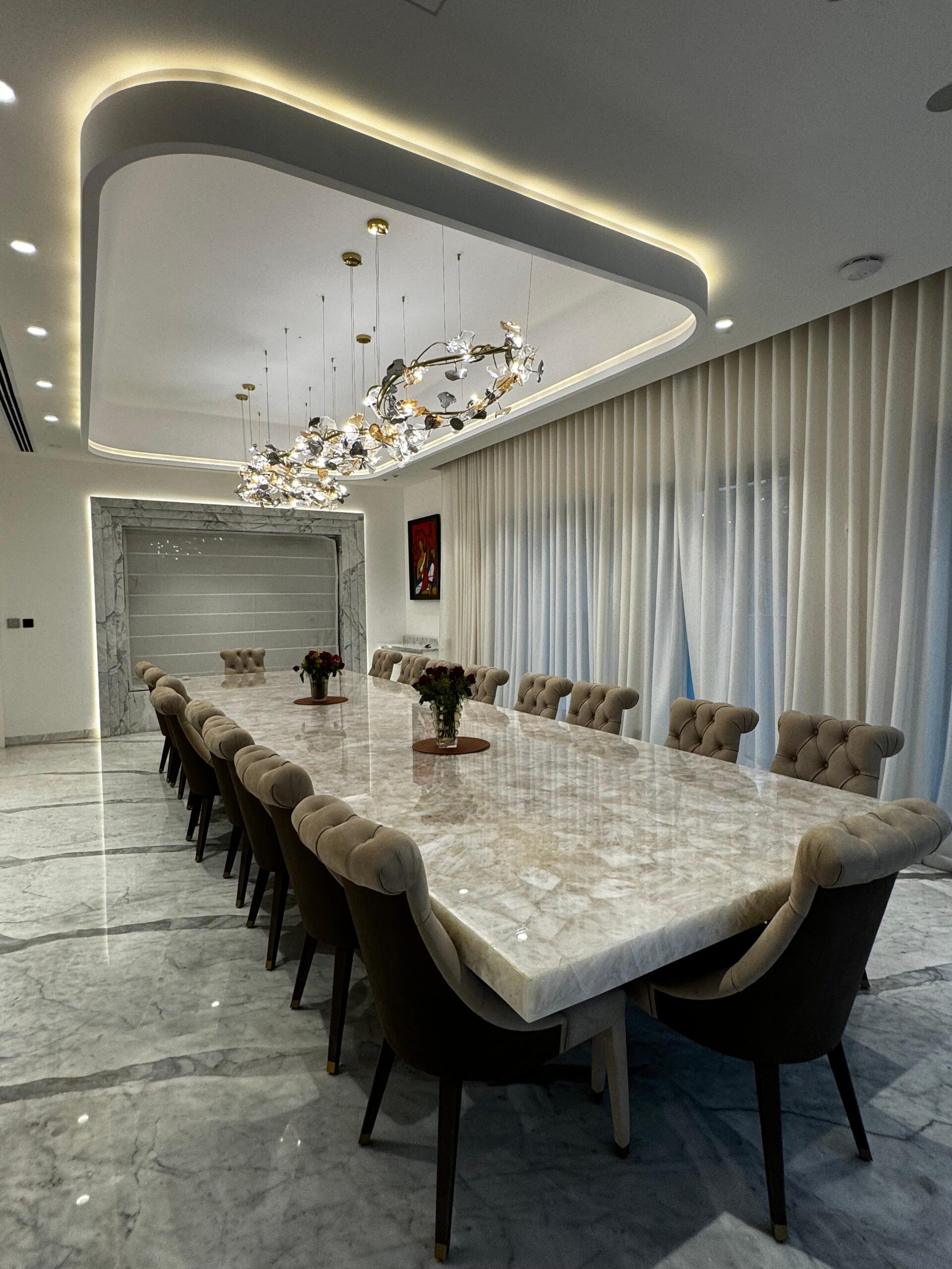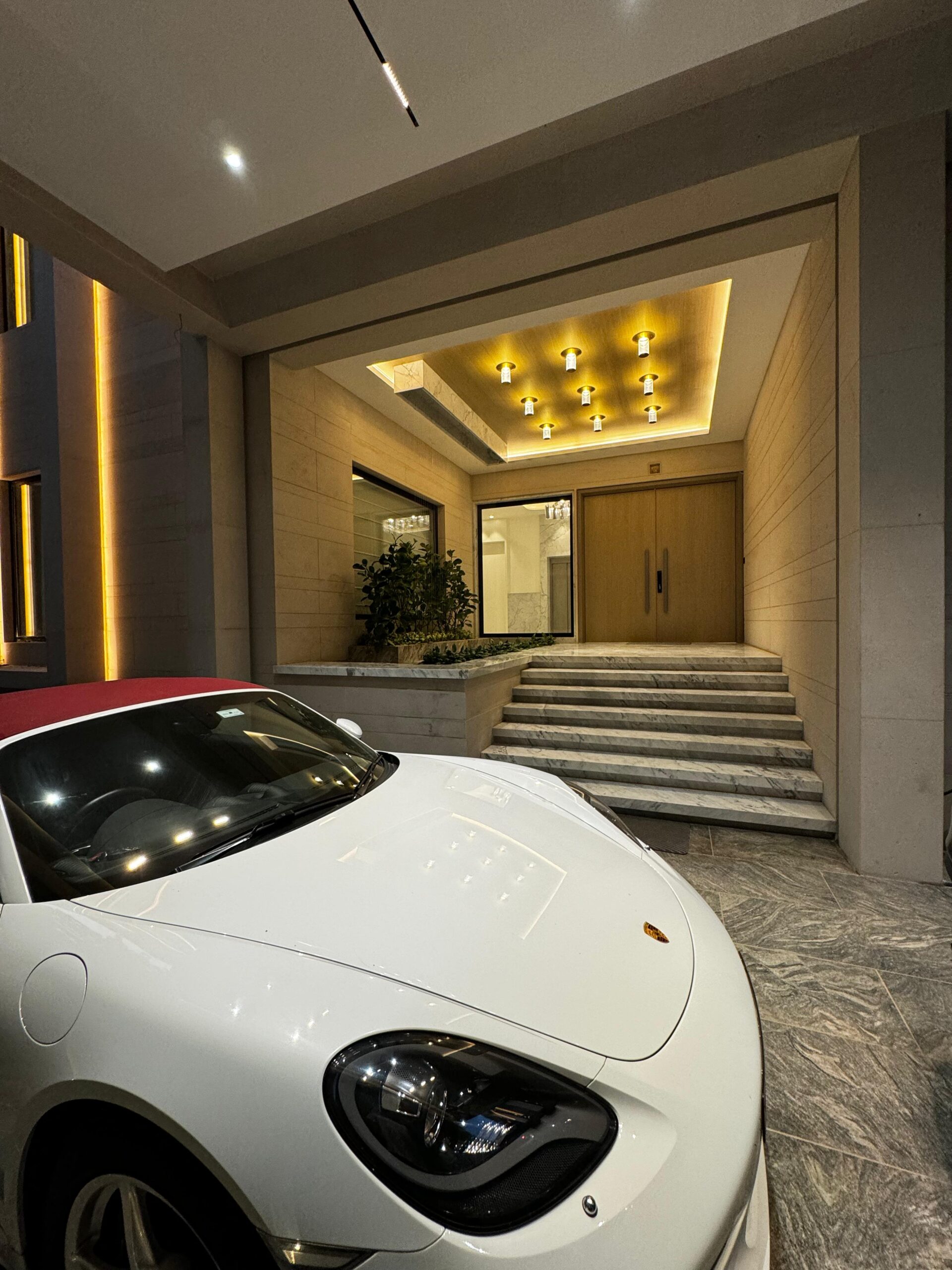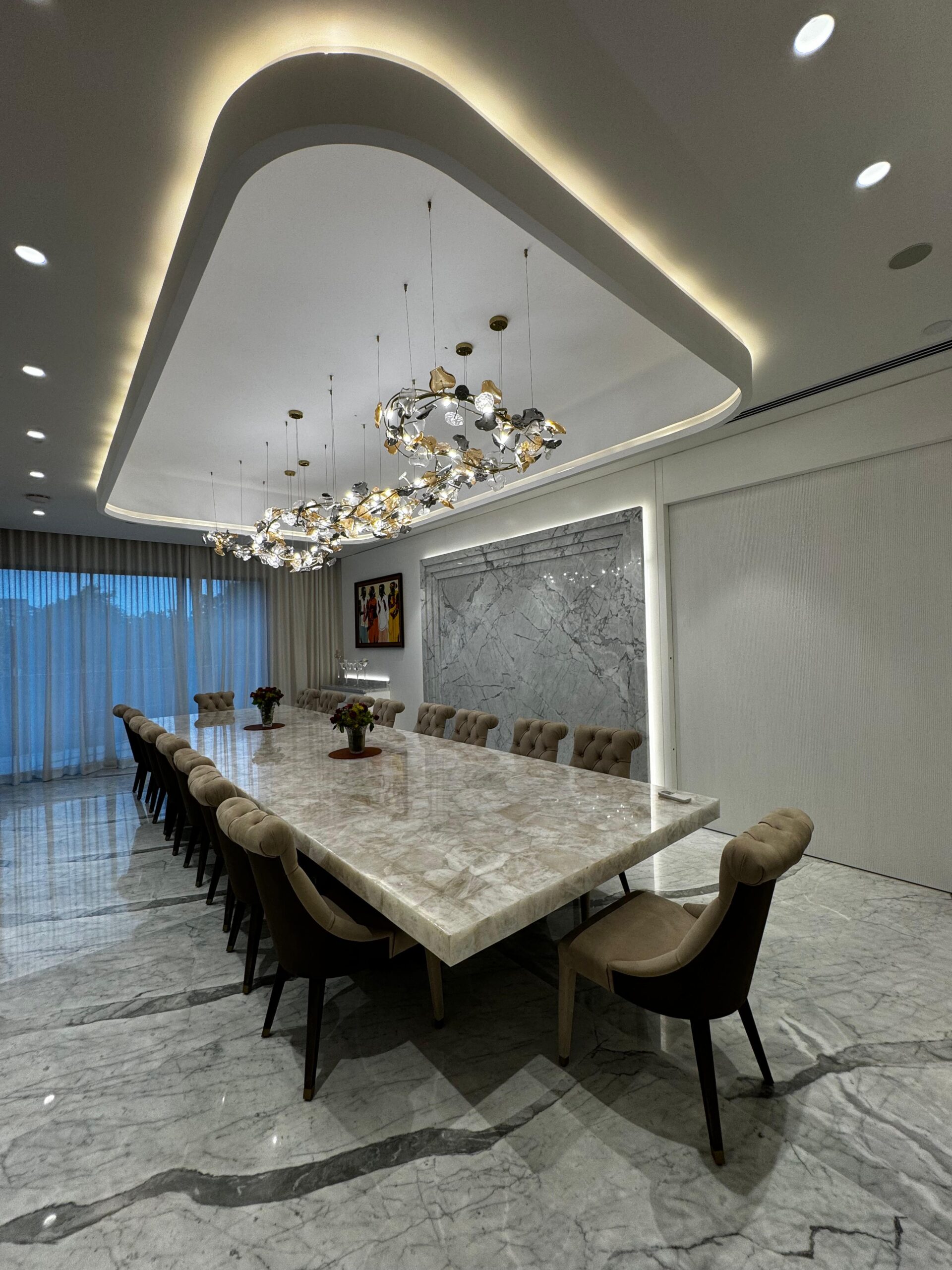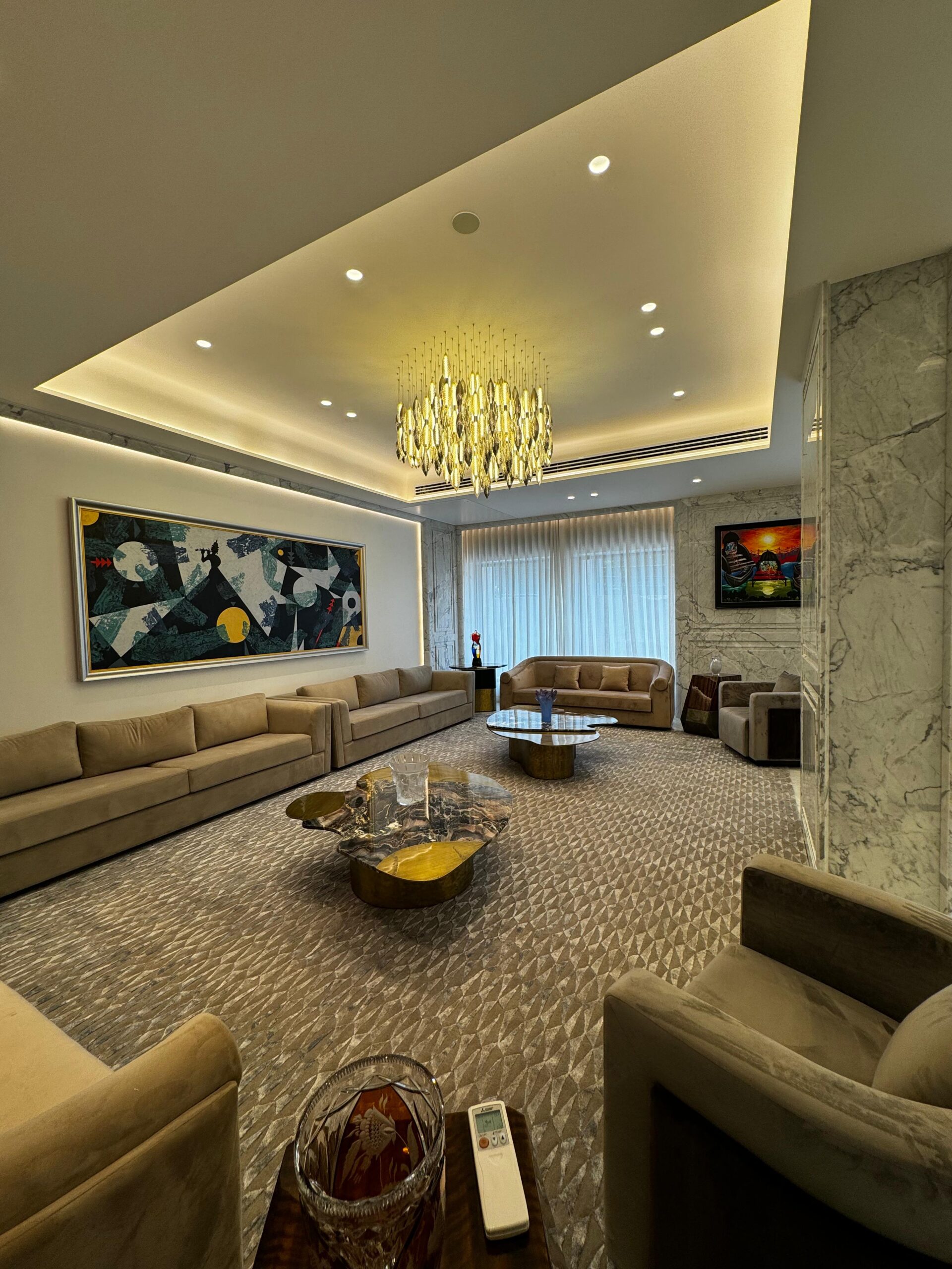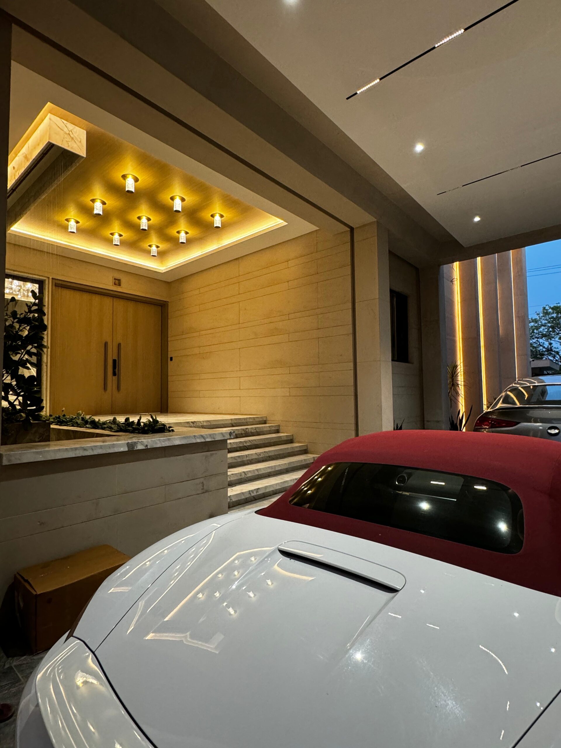 Clean geometry and luxury materials are complemented by dynamic lighting — recessed strips, chandeliers, and cove details blend into marble, stone, and texture-rich finishes. Exterior lighting outlines the structure’s strength, while indoor zones glow with ambient richness and flexibility.