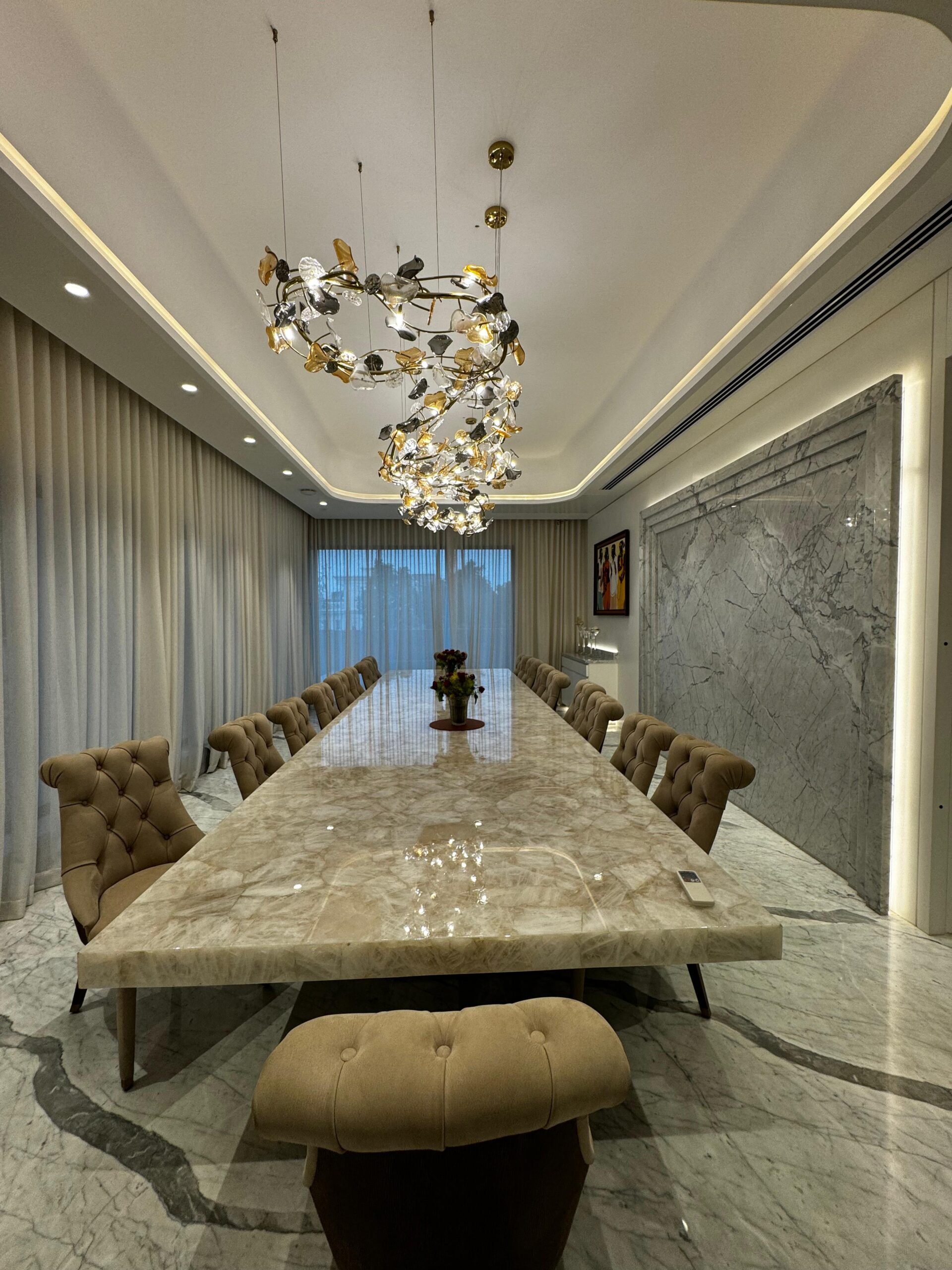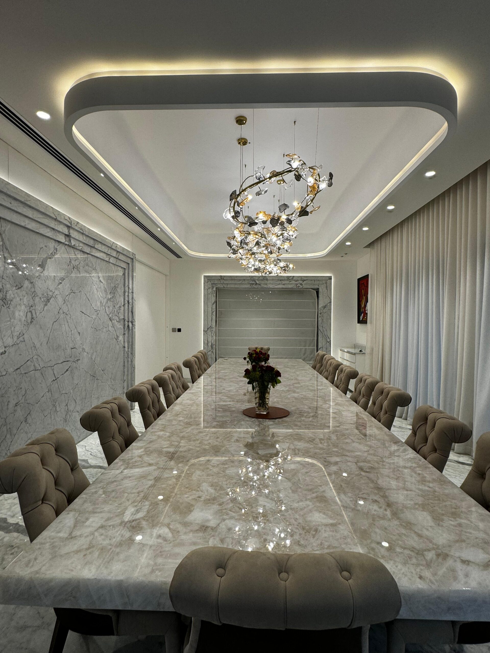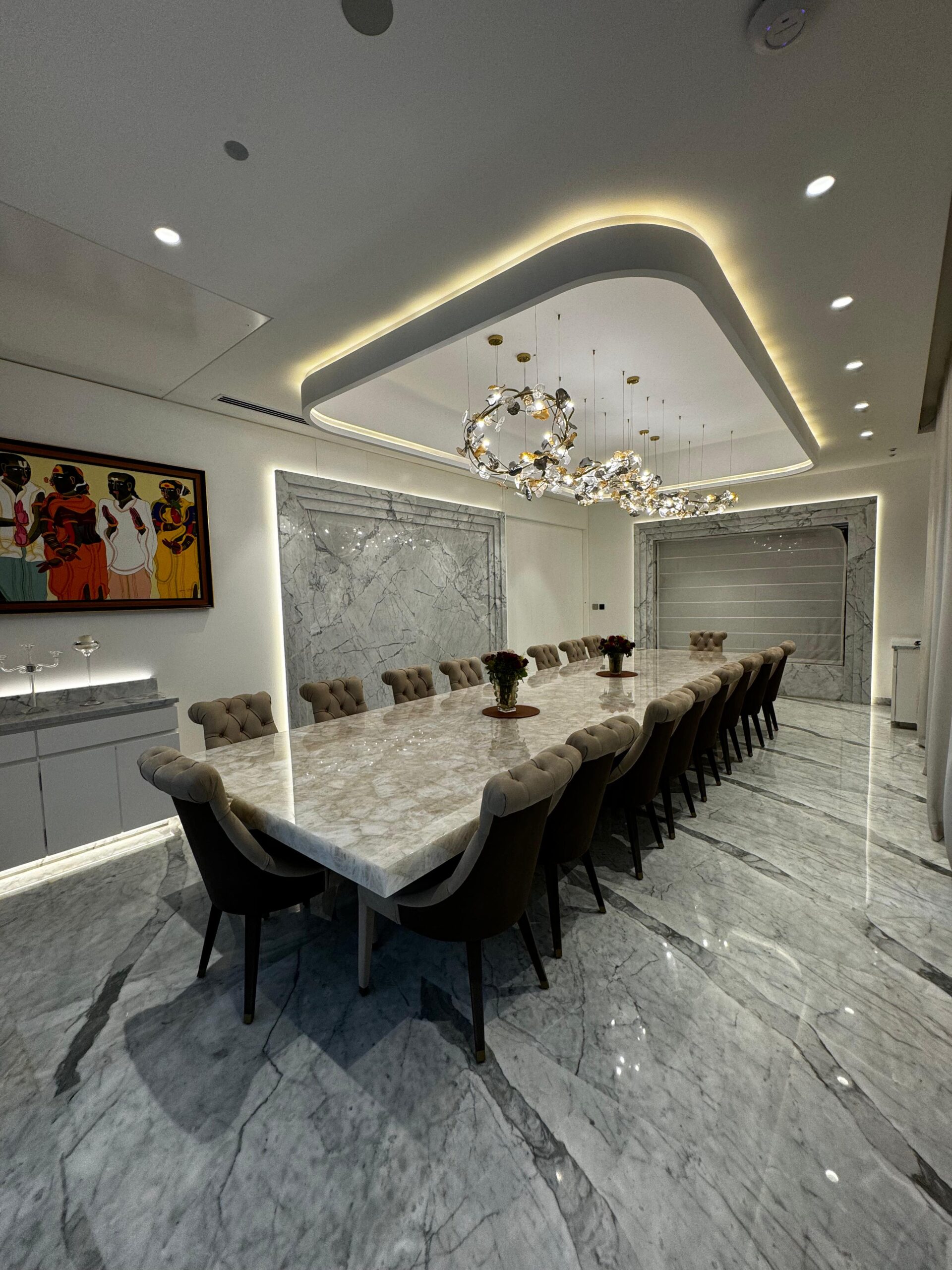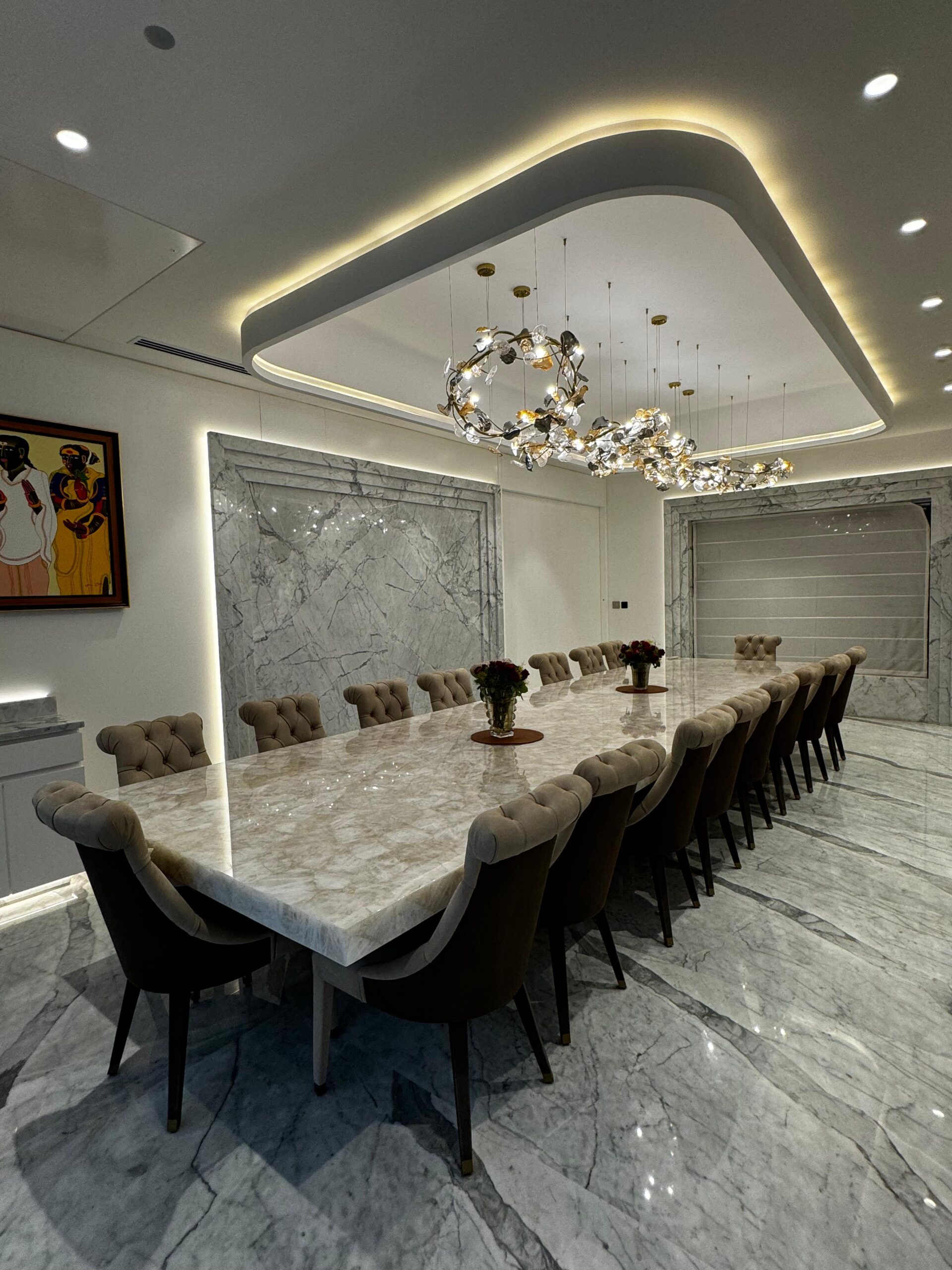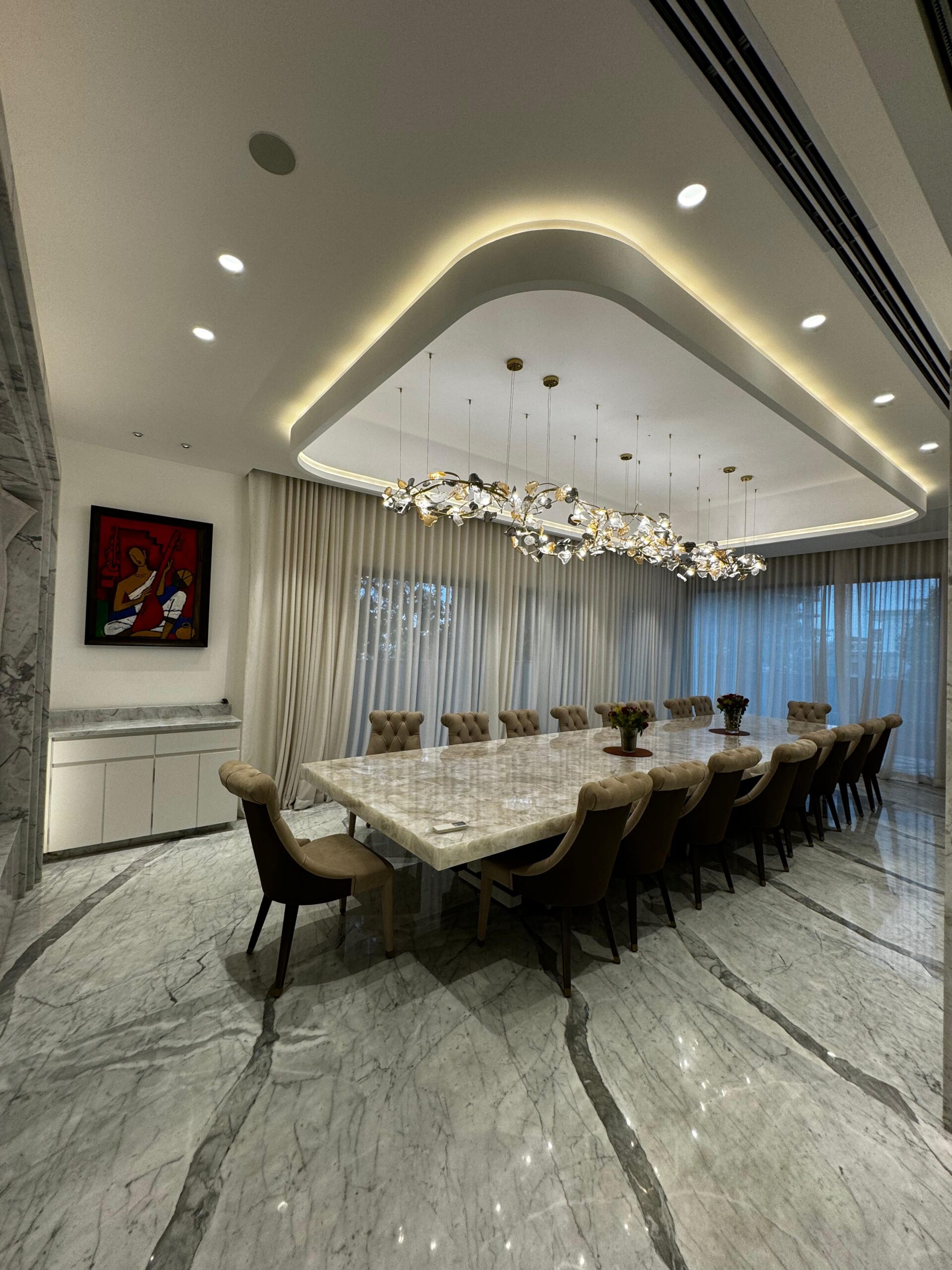 Clean geometry and luxury materials are complemented by dynamic lighting — recessed strips, chandeliers, and cove details blend into marble, stone, and texture-rich finishes. Exterior lighting outlines the structure’s strength, while indoor zones glow with ambient richness and flexibility.